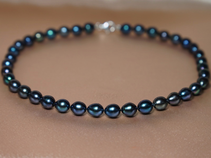 Elegantní náhrdelník z černých oválných sladkovodních perel velikosti cca 8 -9 mm. Perly jsou kvality AA+ (lesk AA+, čistota povrchu AAA), mají hladký povrch a vysoký lesk. Mezi každou perlou jsou navázány uzlíky z důvodu krásnějšího vzhledu a bezpečnosti. Náhrdelník má délku cca 450 mm a je ukončen uzávěrem ze stříbra ryzosti 925/1000. Na požádání vyrobíme náhrdelník s jinou délkou nebo s jiným uzávěrem. Tento šperk je vhodný na vzácné příležitosti. Šperky posíláme v dárkovém balení s certifikátem pravosti.