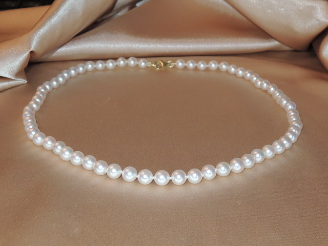 Náhrdelník vyrobený z japonských bílých mořských Akoya perel velikosti 6-6,5 mm a zapínáním ze zlata. Perly nejvyšší kvality AAA jsou dokonale kulaté a mají nádherný vysoký lesk a hladký povrch. Mezi každou perlou jsou navázány uzlíky z důvodu krásnějšího vzhledu a bezpečnosti, navlečené jsou na pevné hedvábné niti. Náhrdelník je možné vyrobit v různých délkách s přiměřeným zvýšením nebo snížením ceny. Náhrdelník je ukončen uzávěrem ze žlutého, nebo bílého zlata ryzosti 585/1000 (14kt.). K náhrdelníku dostanete zdarma certifikát pravosti, dárkovou kazetu a v rámci Česka a Slovenska máte dopravu zdarma.