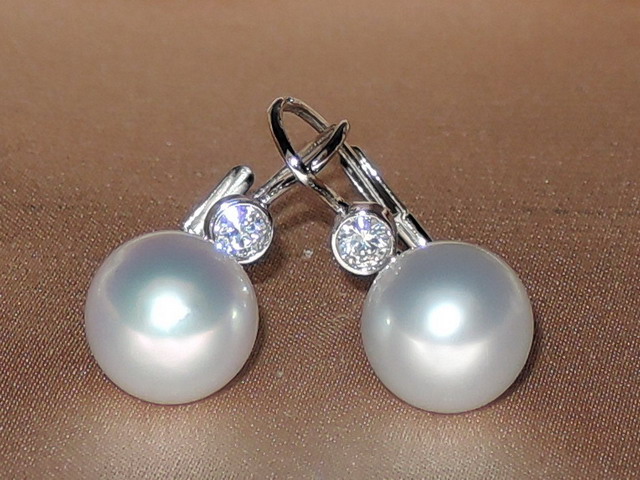 Perlové náušnice vyrobené z pravých bílých perel Jižního Pacifiku a kování z bíleho zlata ryzosti 585/1000 (14kt.). Perly nejvyšší kvality AAA mají kulatý tvar, hladký povrch a velmi vysoký lesk. Kování náušnic skládají z patentů kombinovaných se zirkony nebo brilianty. Brilianty jsou v kvalitě VVS / G, H. Veľlkosť kamenů je cca 3 mm / 0,11 ct. Hmotnost páru zlatých kování je cca 1,9 gramu. Velikost perel můžete zvolit od 9 do 12 mm. Na fotografii jsou perly velikosti 9,5 mm. Na požádání k náušnicím doporučíme přívěsek a prsten jako kombinaci do setu šperků. Šperky posíláme v dárkovém balení spolu s certifikátem pravosti. V Čechách máte dopravu zdarma.