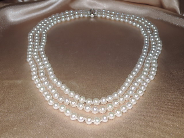 Náhrdelník je vyroben ze tří řad bílých sladkovodních perel velikosti 6 - 6,5 mm. Použité jsou oválně kulaté perly v kvalitě AA+ (tvar AA, čistota povrchu AA+, lesk AAA) s hladkým povrchem a vysokým leskem. Náhrdelník je vázán na pevné hedvábné niti a mezi každou perlou jsou navázány uzlíky z důvodu krásnějšího vzhledu a bezpečnosti. Délka náhrdelníku je cca 47 + 52 + 57 cm a ukončen je uzávěrem ze stříbra ryzosti 925/1000 s hmotností 1,6 gramu. Na požádání vyrobíme náhrdelník v jiných délkách s přiměřeným zvýšením nebo snížením ceny. V případě, že máte zájem i o náramek, standardně je v délce 19 cm. Šperky posíláme v dárkovém balení spolu s certifikátem pravosti a v rámci Česka a Slovenska máte dopravu zdarma.