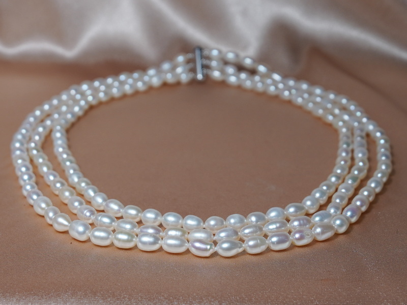 Třířadý perlový náhrdelník TON06A+wG je vyroben ze tří řad bílých sladkovodních oválných perel kvality A+ velikosti cca 6x8 mm. Náhrdelník je vázán na pevné hedvábné niti a uzlíky jsou za každou 5. perlou. Délka pramenů náhrdelníku je cca 47 + 52 + 57 cm a ukončen je uzávěrem ze stříbra ryzosti 925/1000. Na požádání vyrobíme náhrdelník v jiných délkách s přiměřeným zvýšením nebo snížením ceny. Perlové šperky posíláme v dárkovém balení spolu s certifikátem pravosti a v rámci Česka a Slovenska dopravu neplatíte.