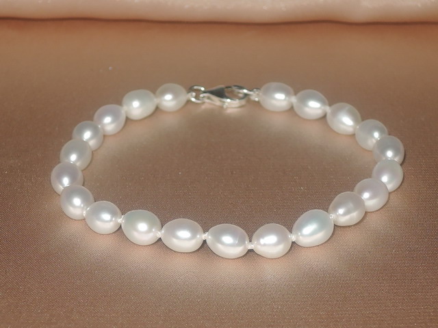 Velmi pěkný jednořadý perlový náramek OSB06AA+wJ vyrobený z bílých podélných sladkovodních perel velikosti cca 6x8 mm. Perly mají vysoký lesk. Mezi každou perlou jsou uzlíky z důvodu bezpečnosti a krásnějšímu vzhledu, navlečené jsou na dvojité hedvábné niti. Délka náramku je cca 195 mm, ukončen je uzávěrem ze stříbra ryzosti 925/1000. Šperky posíláme v dárkovém balení.