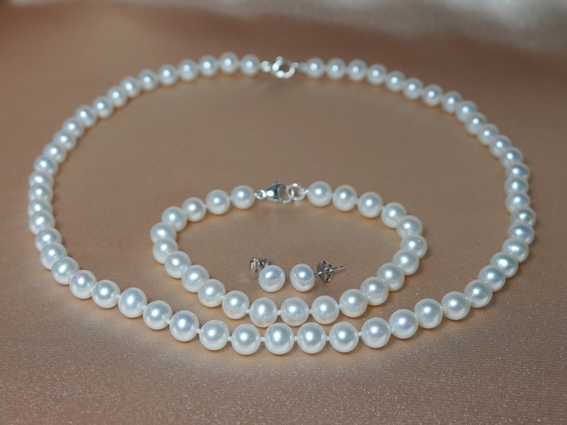 Na náhrdelník a náramek jsou použity bílé říční perly kvality AA+ (tvar AA+, lesk AA+, čistota povrchu AA+) velikosti 7 – 7,5 mm. Perly mají vysoký lesk, téměř kulatý tvar a hladký povrch s drobnými nedostatky. Mezi každou perlou náhrdelníku a náramku jsou navázány uzlíky kvůli krásnějšímu vzhledu a bezpečnosti, navlečeny jsou na pevné hedvábné niti. Náhrdelník i náramek jsou ukončeny karabinkou ze žlutého nebo bílého zlata ryzosti 585/1000 (14kt.), nebo stříbra ryzosti 925/1000. Délka náhrdelníku je 41 cm nebo 45 cm, náramek 19,5 cm. Fotografie jsou autentické.