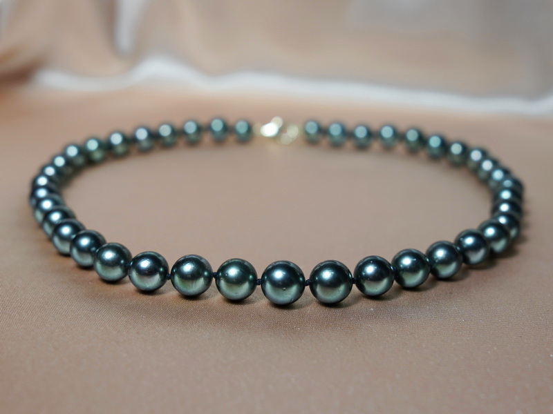 Perlový náhrdelník TPN054M z tahitských perel velikosti 8,3 mm při uzávěru, které se postupně zvětšují až po 11 mm ve středu náhrdelníku v kvalitě (tvar AAA, lesk AA+, povrch AA).