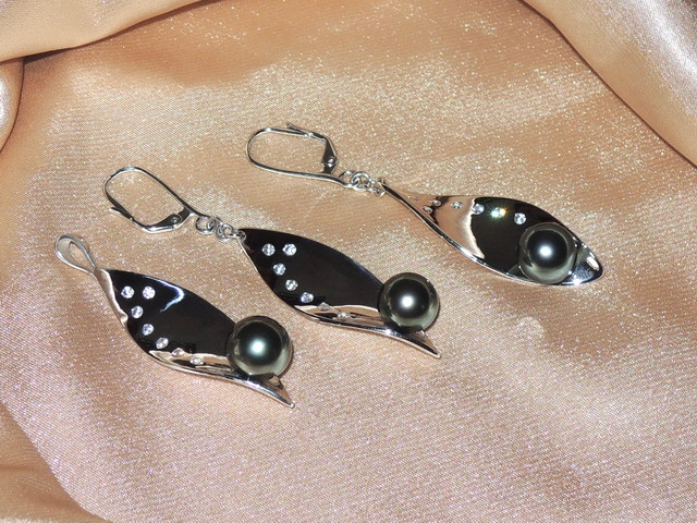 Luxusní set šperků sestává z náušnic BC02WE-T a přívěsku BC02WP-T. Náušnice a přívěsek jsou kombinací kování ze zlata, zirkonů nebo briliantů a tahitských perel. Perly nejvyšší kvality AAA mohou mít velikost od 9 do 12 mm, mají hladký povrch a velmi vysoký lesk. Kování jsou vyrobeny z bílého zlata ryzosti 585/1000 (14kt.) Kombinované se zirkony nebo brilianty velikosti cca 2mm / 0,033ct. Brilianty jsou v kvalitě VVS / G, H. Celková hmotnost zlata páru náušnic je cca 11,0 gramu, hmotnost zlata přívěsku je cca 5,30 gramu. Velikost kování náušnic je cca 42 mm, celková délka náušnic s patentem cca 68 mm, celková délka přívěsku cca 50 mm. Tento set je jedním z luxusních šperků vlastního designu "BCstyle". Šperky splní očekávání náročých klientů, kteří hledají nejvyšší kvalitu ve spojení s jedinečností šperku, který nelze vidět v nabídkách jiných prodejen. Šperky posíláme v dárkovém balení spolu s certifikátem pravosti. V Čechách vám ho doručíme zdarma.