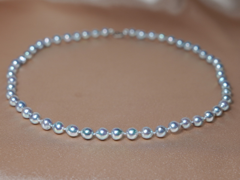 Perlový náhrdelník APN6570AAsM vyrobený z japonských šedých mořských akoya perel velikosti 6,5 - 7 mm a uzávěru z bílého 14 kt. zlata (585/1000). Perly v kvalitě (lesk AAA, povrch A+) mají vysoký lesk, nepravidelný tvar a přírodní barvu (nejsou dobarvovány!). Fotografie jsou autentické. Na povrchu perel se vyskytují nedokonalosti v rámci uvedené kvality. Mezi každou akoya perlou jsou navázány uzlíky kvůli krásnějšímu vzhledu a bezpečnosti, navlečené jsou na pevné hedvábné niti. Perlový náhrdelník lze vyrobit v různých délkách s přiměřeným zvýšením nebo snížením ceny.