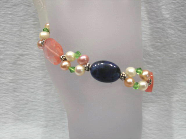 Dvojprameňový náramek vyrobený z růžových a bílých sladkovodních perel velikosti 5-6 mm kombinovaných s tmavě modrými a světle červenými broušenými kameny. Náramek je ukončen jednoduchým uzávěrem. Délka náramku je cca 190 mm. Šperky posíláme v dárkovém balení.
