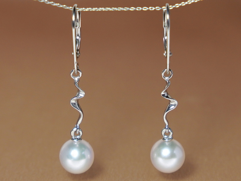 Zlaté visací náušnice FE002wM z bílých sladkovodních perel kvality AAA a kování z bílého zlata ryzosti 585/1000 (14kt.). Perly mají kulatý tvar, hladký povrch a vysoký lesk.