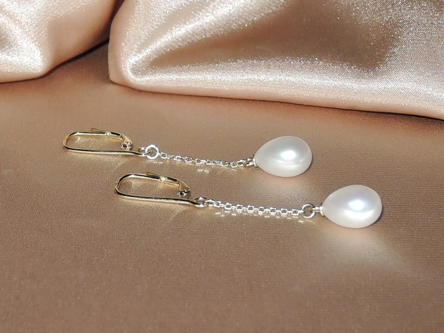 Perlové náušnice vyrobené z pravých bílých sladkovodních perel a kování ze žlutého zlata ryzosti 585/1000. Perly tvaru slzy velikosti cca 10 x 12 mm s povrchovou kvalitou AAA mají hladký povrch a vysoký lesk. Kování náušnic sestávají z patentů a řetízky. Délka náušnic včetně perel je cca 60 mm, délka řetízku cca 20 mm. Hmotnost páru zlatých kování je cca 1,95 gramu, celková hmotnost náušnic cca 5 gramů. Na požádání k náušnicím doporučíme přívěsek jako kombinaci do setu šperků. Šperky posíláme v dárkovém balení spolu s certifikátem pravosti.