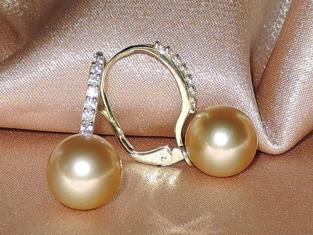 Perlové náušnice vyrobené z pravých zlatožlutých perel Jižního Pacifiku a kování ze žlutého zlata ryzosti 585/1000 (14kt.). Perly nejvyšší kvality AAA mají kulatý tvar, hladký povrch a velmi vysoký lesk. Kování náušnic sestávají z patentů kombinovaných se zirkony nebo brilianty. Brilianty jsou v kvalitě VVS / G, H. Každá náušnice má 7 ks kamenů velikosti cca 1,5mm / 0,014ct. Hmotnost páru zlatých kování je cca 2,15 gramu. Velikost perel můžete zvolit od 9 do 12 mm. Na fotografii jsou perly velikosti 9,5 mm. Na požádání k náušnicím doporučíme přívěsek a prsten jako kombinaci do setu šperků. Šperky posíláme v dárkovém balení spolu s certifikátem pravosti. V Čechách vám ho doručíme zdarma.