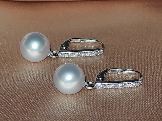 Perlové náušnice vyrobené z pravých bílých perel Jižního Pacifiku a kování z bíleho zlata ryzosti 585/1000 (14kt.). Perly nejvyšší kvality AAA mají kulatý tvar, hladký povrch a velmi vysoký lesk. Kování náušnic sestávají z patentů kombinovaných se zirkony nebo brilianty. Brilianty jsou v kvalitě VVS / G, H. Každá náušnice má 7 ks kamenů velikosti cca 1,5mm / 0,015ct. Hmotnost páru zlatých kování je cca 2,05 gramu. Velikost perel můžete zvolit od 9 do 12 mm. Na fotografii jsou perly velikosti 9,5 mm. Na požádání k náušnicím doporučíme přívěsek a prsten jako kombinaci do setu šperků. Šperky posíláme v dárkovém balení spolu s certifikátem pravosti. V Čechách máte dopravu zdarma.