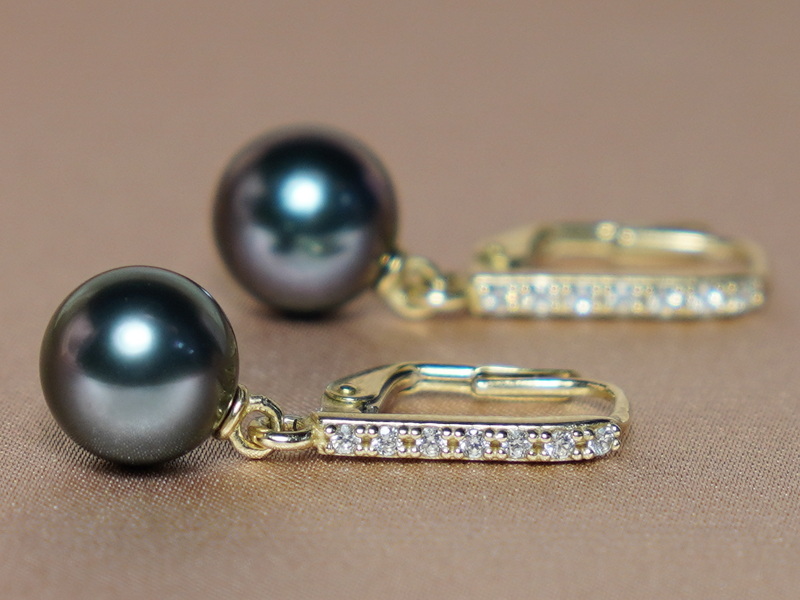 Perlové náušnice BC024YE-TAA+ jsou vyrobeny z pravých tahitských perel a kování ze žlutého zlata ryzosti 585/1000 (14kt.) se zirkony.