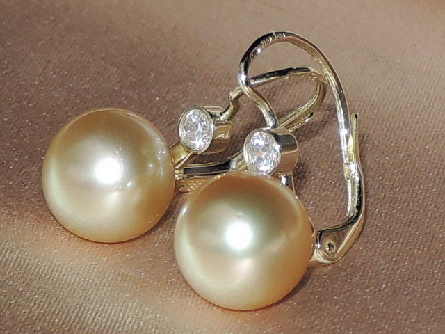 Perlové náušnice vyrobené z pravých zlatožlutých perel Jižního Pacifiku a kování ze žlutého zlata ryzosti 585/1000 (14kt.). Perly nejvyšší kvality AAA mají kulatý tvar, hladký povrch a velmi vysoký lesk. Kování náušnic skládají z patentů kombinovaných se zirkony nebo brilianty. Brilianty jsou v kvalitě VVS / G, H. Veľlkosť kamenů je cca 3 mm / 0,11 ct. Hmotnost páru zlatých kování je cca 1,9 gramu. Velikost perel můžete zvolit od 9 do 12 mm. Na fotografii jsou perly velikosti 9,5 mm. Na požádání k náušnicím doporučíme přívěsek a prsten jako kombinaci do setu šperků. Šperky posíláme v dárkovém balení spolu s certifikátem pravosti. V Čechách vám ho doručíme zdarma.