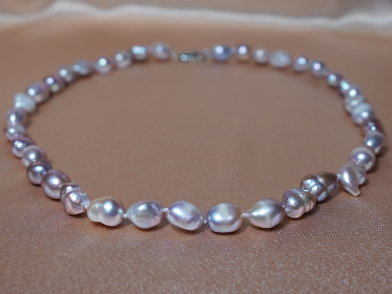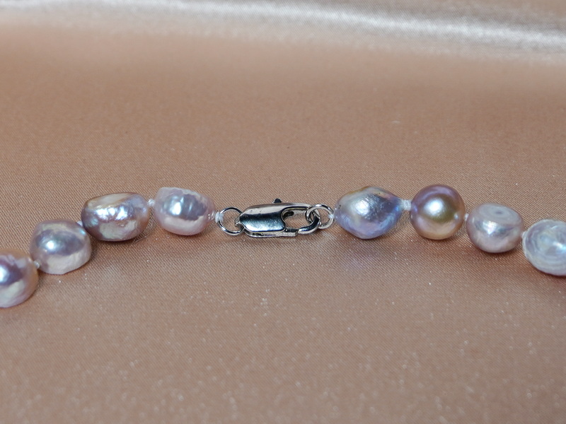 Perlový náhrdelník BPN8090AlG vyroben z fialovorůžových sladkovodních podlouhlých perel nepravidelného tvaru velikosti cca 8-9 x 10-12 mm. Náhrdelník je vázán na pevné hedvábné niti a mezi každou perlou jsou navázány uzlíky kvůli krásnějšímu vzhledu a bezpečnosti.