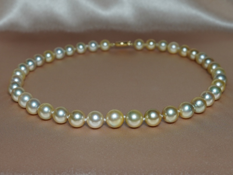 Perlový náhrdelník vyrobený ze zlatožlutých perel Jižního Pacifiku velikosti 10 - 11,5 mm a uzávěru ze zlata. Perly kvality AA (tvar AAA, lesk AA, povrch AA) jsou dokonale kulaté a mají vysoký lesk. Na povrchu perel se vyskytují drobné nedokonalosti v rámci uvedené kvality. Mezi každou perlou jsou navázány uzlíky z důvodu krásnějšího vzhledu a bezpečnosti, navlečené jsou na pevné hedvábné niti. Náhrdelník má délku 47 cm a je ukončen uzávěrem ze žlutého zlata ryzosti 585/1000 (14kt.). K náhrdelníku dostanete zdarma certifikát pravosti, dárkovou kazetu a v rámci Česka a Slovenska vám ho doručíme zdarma.