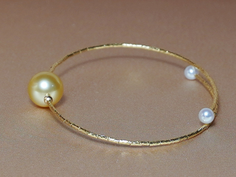 Perlový náramek GB18KAAAZY je elegantní šperk vyrobený ze zlatožluté perly Jižního Pacifiku, dvou bílých sladkovodních perel, paměťového drátu a žlutého 18 kt. zlata. Základ tvoří pružný paměťový drát, na kterém jsou navlečeny zlaté trubkové komponenty ryzosti 750/1000 o hmotnosti 0,35 g, sladkovodní perly o průměru přibližně 4 mm na koncích a perla Jižního Pacifiku o velikosti 9 - 10 mm ve středu náramku.