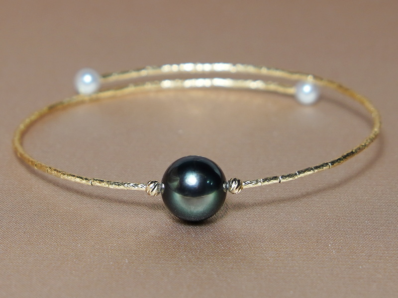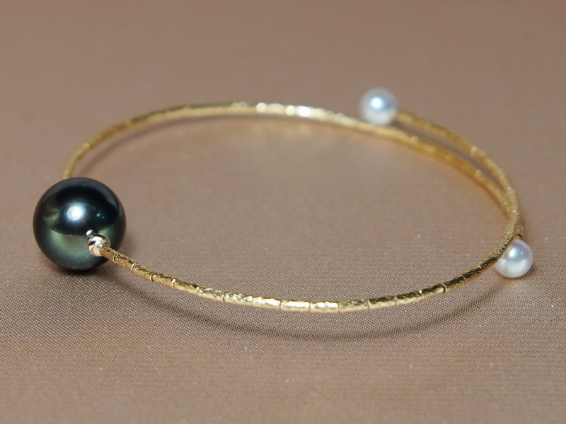 Perlový náramek TB18KAA+ZY je elegantní šperk vyrobený z tahitské perly, dvou bílých sladkovodních perel, paměťového drátu a žlutého 18 kt. zlata. Základ tvoří pružný paměťový drát, na kterém jsou navlečeny zlaté trubkové komponenty ryzosti 750/1000 o hmotnosti 0,35 g, sladkovodní perly o průměru přibližně 4 mm na koncích a tahitská perla o velikosti 9,5 – 10 mm ve středu náramku.