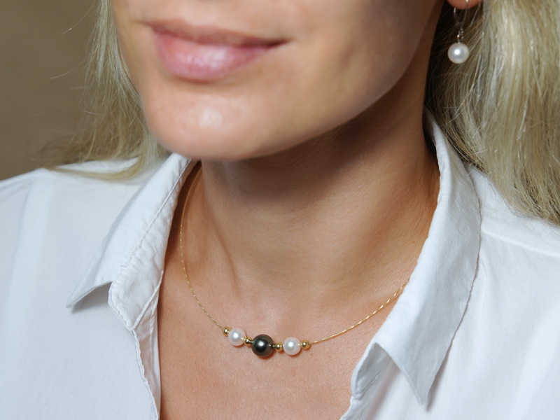 Perlový náhrdelník i náramek sestávají ze dvou bílých akoya perel a jedné tahitské perly, které jsou navlečeny na lanku z 18 kt. zlata. Uvnitř zlatých lanek je titanové vlákno, které zajišťuje jejich pružnost a drží kruhový/elipsový tvar. Perly jsou odděleny a zafixovány čtyřmi kuličkami z 18 kt. zlata se silikonovým vnitřkem.