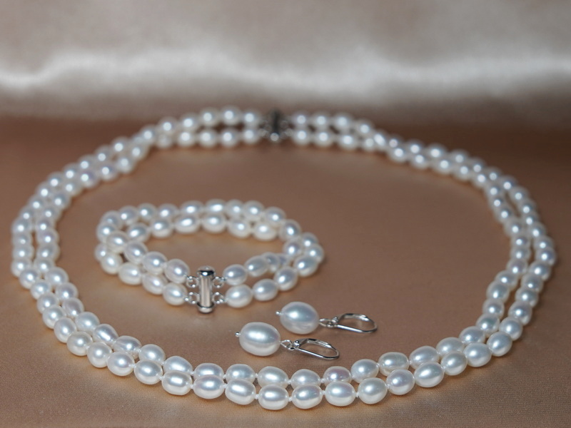 Patenty i celé kování je ze stříbra ryzosti 925/1000 o hmotnosti 1 gram. Na náhrdelník a náramek jsou použity podlouhlé perly velikosti cca 6 x 8 mm v kvalitě AA + s hladkým povrchem a velmi vysokým leskem. Na povrchu perel se mohou vyskytnout drobné nedokonalosti. Náhrdelník i náramek jsou vázány na pevné hedvábné niti a mezi každou perlou jsou uzlíky z důvodu krásnějšího vzhledu a bezpečnosti. Náhrdelník má délku cca 58 + 55 cm, náramek 2 x 19,5 cm a ukončené jsou uzávěry ze stříbra ryzosti 925/1000 o hmotnosti 1,70 g. Na požádání vyrobíme náhrdelník i náramek v jiných délkách s přiměřeným zvýšením nebo snížením ceny. Náušnice je možné vyměnit za jiné dle nabídky v e -shopy za příplatek. Šperky jsou vhodné na vzácné příležitosti.