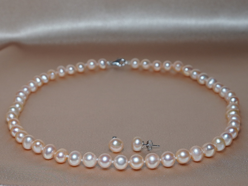 Elegantní sada šperků z růžových sladkovodních perel ORSET8085AApG je vyrobena z pravých broskvově růžových perel o průměru přibližně 8–8,5 mm. Náhrdelník je tvořen oválně kulatými perlami v kvalitě AA (tvar A+, lesk AA+, čistota povrchu AA), navlečenými na pevné hedvábné niti s uzlíky mezi každou perlou. Délka náhrdelníku je cca 45 cm a zapínání je ze stříbra ryzosti 925/1000. Na přání upravíme délku náhrdelníku a za příplatek vyrobíme také náramek ze stejných perel.