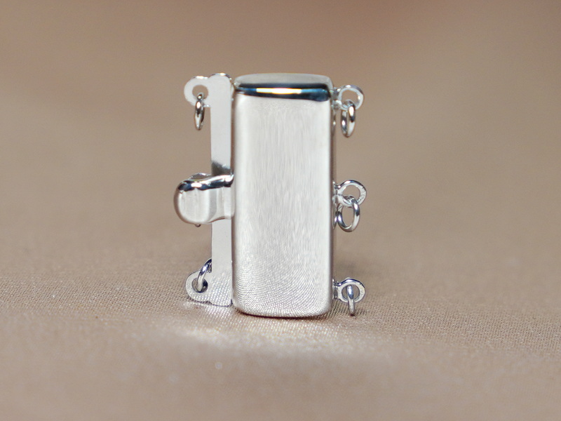 Šperkový uzávěr TU100wK pro výrobu třířadého náhrdelníku. Uzávěr je vyroben ze 14 karátového bílého zlata - ryzost 585/1000. Velikost uzávěru je cca 15 x 20 mm. Hmotnost je cca 2,90 gramů. Uzávěr lze použít i k náramkům a náhrdelníkům v našem e-shopu (vyměnit za jednoduché uzávěry ze stříbra, nebo zlata s odpovídajícím doplatkem), případně použít na váš náhrdelník, který chcete nově přeuzlíkovat. Uzávěr bezpečně zacvakne při uzavření a nelze jej otevřít bez stisknutí jazýčku.