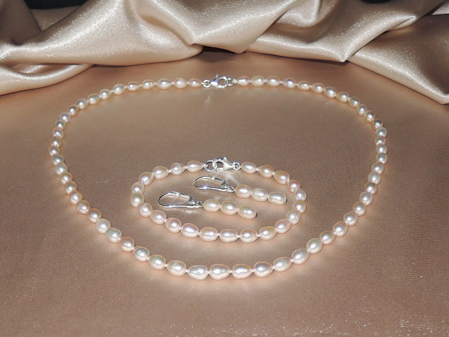 Set šperků z broskvově růžových oválných sladkovodních perel velikosti cca 6 mm v kvalitě AA. Perly mají vysoký lesk a na povrchu se vyskytují mírné nedokonalosti. Mezi každou perlou jsou navázány uzlíky z důvodu krásnějšího vzhledu a bezpečnosti. Náhrdelník má délku cca 450 mm nebo 500 mm, náramek má délku cca 190 mm. Ukončené jsou uzávěry ze stříbra ryzosti 925/1000. Náušnice jsou dlouhé cca 35 mm ukončené stříbrným patentem ryzosti 925/1000. Šperky jsou určeny na běžné nošení. Na požádání vyrobíme šperky v jiných délkách. Šperky posíláme v dárkovém balení a s certifikátem pravosti.