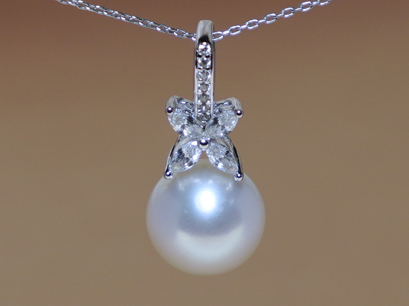Perla o velikosti přibližně 10,5 mm s povrchovou kvalitou AAA má zploštělý tvar (button), hladký povrch a vysoký lesk. Stříbrné kování o hmotnosti 1,2 g je kombinováno se zirkony a je povrchově upraveno rhodiem, takže nezčerná. Celková výška přívěsku je 23 mm, šířku udává velikost perly, čili přibližně 10,5 mm. Otvor pro řetízek má rozměry 4 x 2 mm, dostatečně velký pro většinu řetízků.