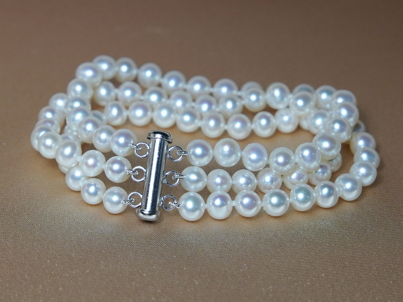 Náramek TB6065AA+wT je vyroben ze tří řad bílých sladkovodních perel velikosti 6 - 6,5 mm a stříbrného uzávěru.