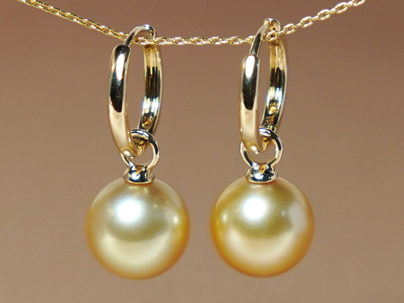 Perly mají kulatý tvar, hladký povrch a velmi vysoký lesk. Perly jsou uchyceny pomocí dostatečně průchozích oček, které se jednoduše navlékají na zlaté náušnicové kroužky o průměru 12 mm. Velikost perel si můžete zvolit v rozsahu 8,5 – 11 mm (na fotografiích jsou perly velikosti 9 mm). Hmotnost páru zlatých kování (kroužky spolu s očky na perly) je 1,45g.