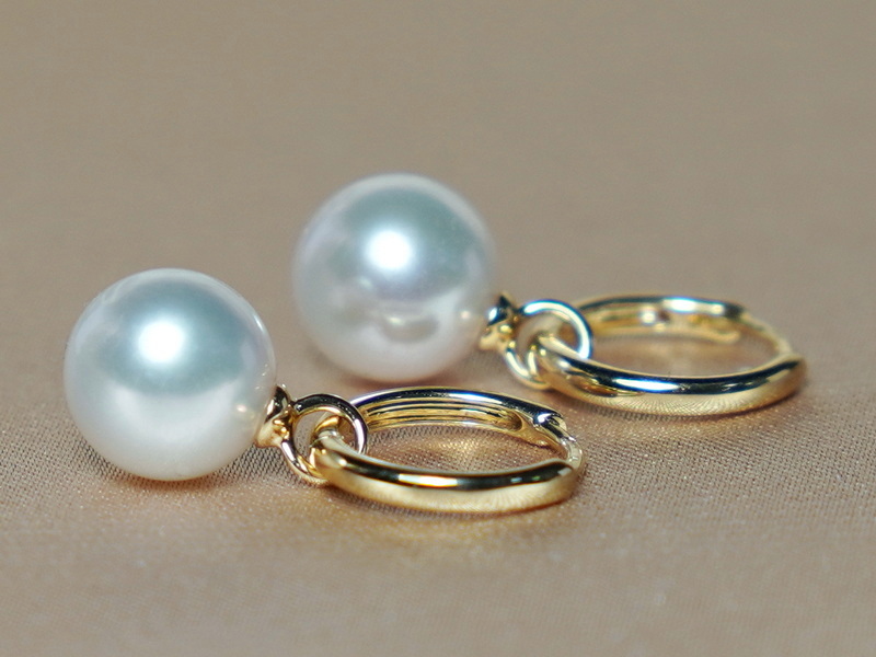 Perly kvality AAA mají kulatý tvar, hladký povrch a velmi vysoký lesk. Perly jsou uchyceny pomocí dostatečně průchozích oček, které se jednoduše navlékají na zlaté náušnicové kroužky o průměru 12 mm. Velikost perel si můžete zvolit v rozsahu 6 – 10 mm (na fotografiích jsou perly velikosti 8,5 mm). Hmotnost páru zlatých kování (kroužky spolu s očky na perly) je 1,45g.