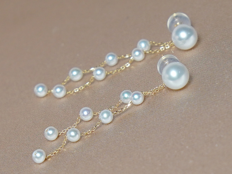 Základ tvoří jednoduché napichovací náušnice s perlami o velikosti 6 – 6,5 mm. K nim lze pomocí očka přidat jemné řetízky se 7 menšími perlami (3 – 3,5 mm), které dodávají šperku výraznější a slavnostnější vzhled. Kování jsou vyrobena ze zlata ryzosti 750/1000 o celkové hmotnosti 0,40 g. Silikonové zasouvací koncovky obsahují malé zlaté puzetky, které zvyšují komfort i bezpečnost při nošení.